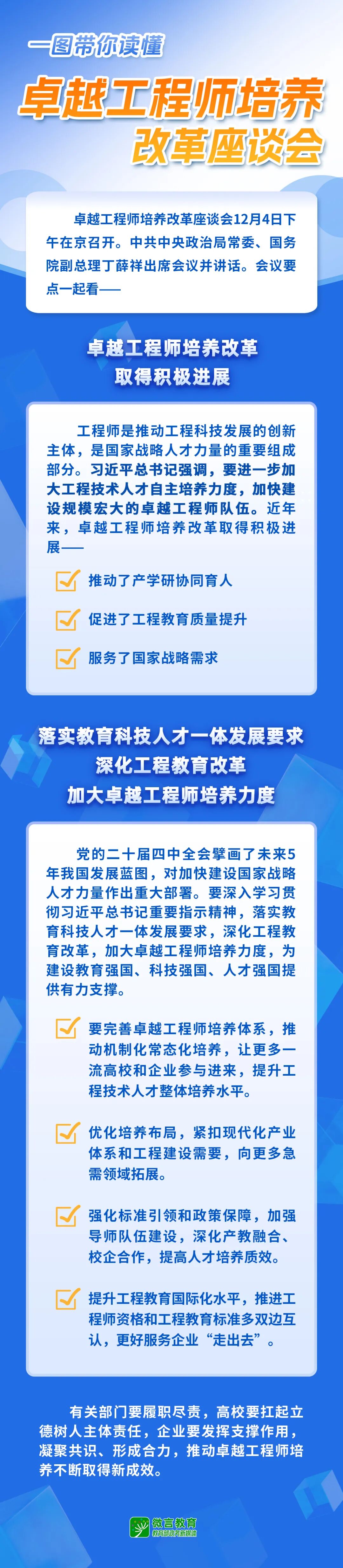 丁薛祥指出,党的二十届四中全会擘画了未来5年我国发展蓝图,对加快建设国家战略人才力量作出重大部署。我们要深入学习贯彻习近平总书记重要指示精神,落实教育科技人才一体发展要求,深化工程教育改革,加大卓越工程师培养力度,为建设教育强国、科技强国、人才强国提供有力支撑。