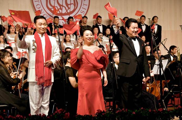 As the finale to the New Year’s concert, Li Wei, Li Jian, and Wang Yida led the 1907 Chamber Chorus to sing the Tongji University song: "Youth China," and the classic song: "My Motherland." All of the actors and members of the audience waved the national flag in their hands and sang in unison to bless the great motherland.