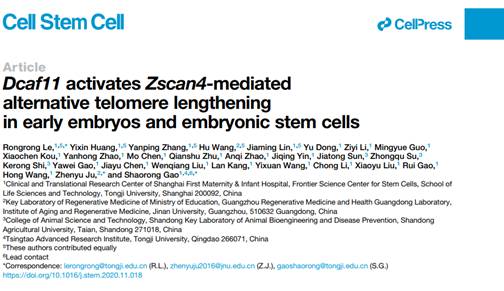 On December 24, a paper entitled “Dcaf11 activates Zscan4-mediated alternative telomere lengthening in early embryos and embryonic stem cells” was published on Cell Stem Cell by Tongji research team headed by Prof. GAO Shaorong, jointly with Jinan University research team headed by Prof. JU Zhenyu.
