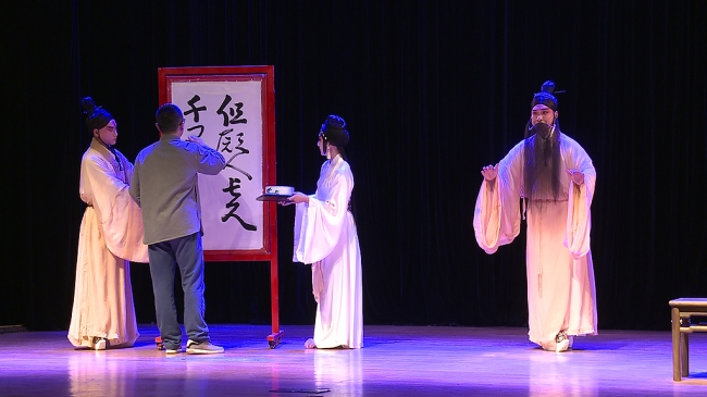The performance was full of sparkling delights during which the audience burst into warm applause for the extraordinary acting skills of new performers, such as LU Su, XU Jianzhong, HU Xuan, TIAN Hui and ZHAO Huan. Amidst the theme, “A Moonlit Night on the Spring River”,and its traditional Peking Opera accompaniment that highlights folk music style, the show brought the audience into an interweaving prospect of Peking Opera and poetry where folk musical instruments, such as the Xindi (a modern transverse flute), the Sheng (a reed pipe wind instrument), and the Erhu (a two-stringed fiddle) were employed.