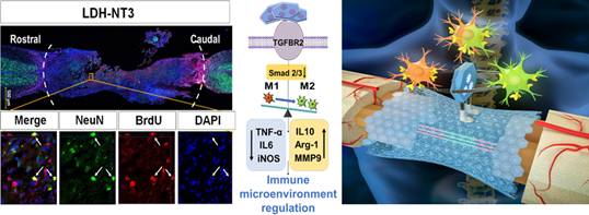 This study finds that LDH can be used to construct a suitable immune microenvironment for SCI recovery and can load various neurotrophic factors, revealing the membrane receptor targets of material to improve the microenvironment and the fundamental molecular mechanism of pro-neural regeneration, providing a new strategy for biological material immune regulation for SCI recovery.
