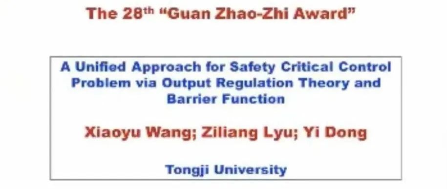 At the 41st Chinese Control Conference (CCC2022), which concluded on July 27, the paper "A Unified Approach for Safety Critical Control Problem via Output Regulation Theory and Barrier Function" jointly written by WANG Xiaoyu, LV Ziliang, Ph.D students of the Department of Control Science and Engineering, School of Electronic and Information Engineering, Tongji University, and their supervisor, researcher DONG Yi, won the 28th "Guan Zhao-Zhi Award". The "Guan Zhao-Zhi Award" is one of the highest Youth Academic Awards in the field of control theory in China. It selects one to two papers from all contributions to the conference. This is the first time that graduate students from Tongji University have won the award.
