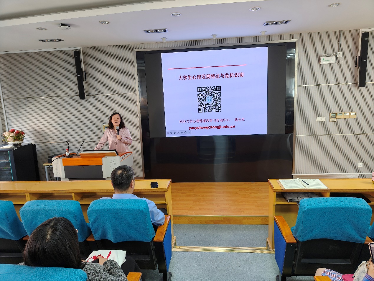 4月29日,化学科学与工程学院特邀同济大学心理健康教育与咨询中心姚玉红教授,为学院全体教职工作了题为《大学生心理发展特征与危机识别》的专题讲座。讲座中,姚玉红教授紧扣当代“大学生心理特征”和“心理危机…
