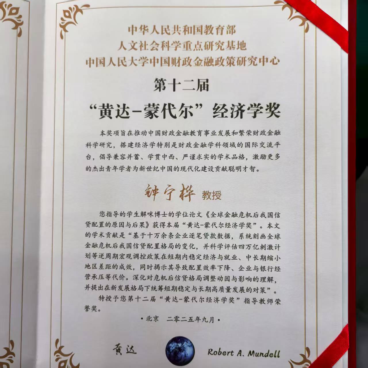 在近日举行的第三届中国金融学科年会(2025)上,经济与管理学院钟宁桦教授指导的博士解咪的论文《全球金融危机后我国信贷配置的原因与后果》荣获第十二届“黄达—蒙代尔经济学奖”。钟宁桦荣获第十二届“黄达—蒙…