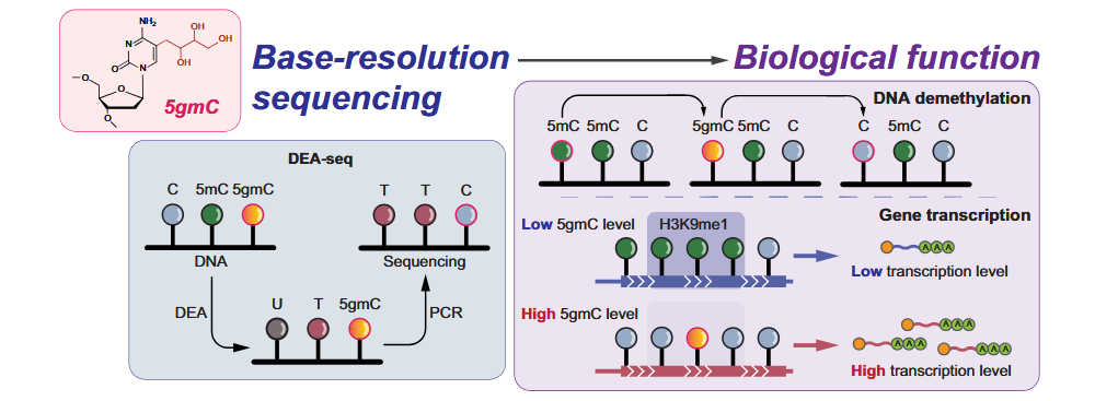 5-甘油基-甲基胞嘧啶(5gmC)是在模式生物莱茵衣藻(Chlamydomonas reinhardtii)中发现的一种新型DNA碱基修饰。与哺乳动物中TET家族蛋白将5-甲基胞嘧啶(5mC)逐步氧化为5-羟甲基胞嘧啶(5hmC)、5-醛基胞嘧啶(5…