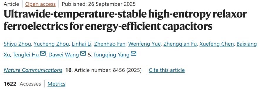 近日,材料科学与工程学院杨同青教授有关电介质储能电容器的研究成果以“Ultrawide-temperature-stable high-entropy relaxor ferroelectrics for energy-efficient capacitors”为题发表于《自然·通讯》期刊(Nat…