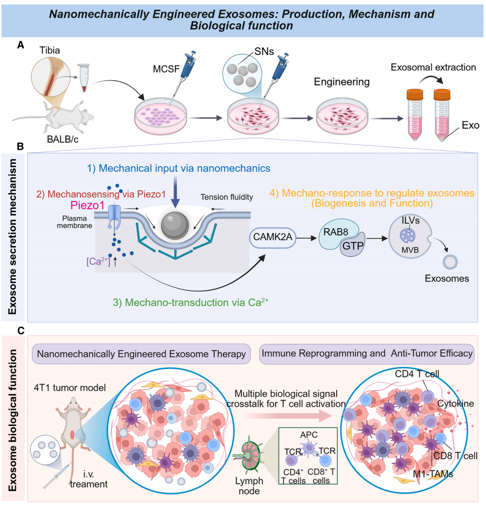 近日,同济大学医学院李永勇/李艳团队在《细胞•生物材料》(Cell Biomaterials)上发表题为“Piezo1-mediated regulation of macrophage-derived exosome secretion via nanoparticle elasticity for tumor immun…