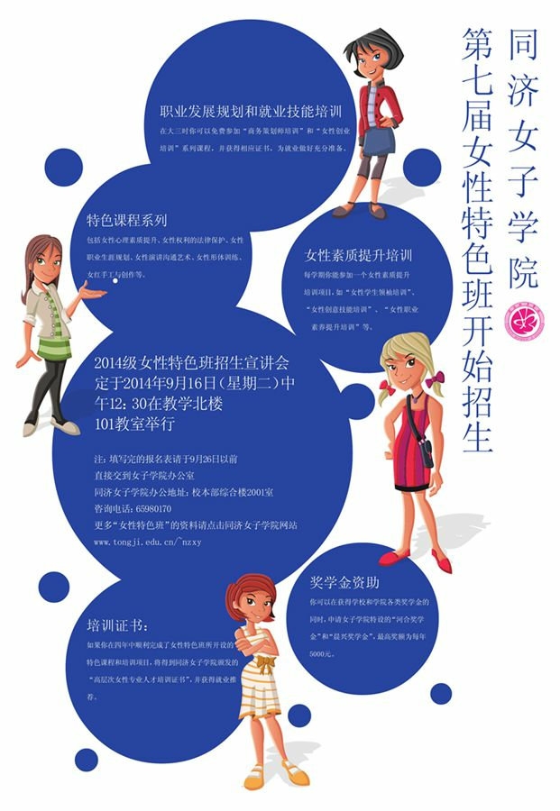 刚刚踏入美丽的同济校园的女生们,在你们踌躇满志地开始人生一段新的旅程时,有没有想过在成为一名优秀的大学毕业生时,收获一份属于女性自身的特长与才能。那就加入我们的行列,报名参加同济女子学院第七届“高层次女性专业人才培养特色班”吧!