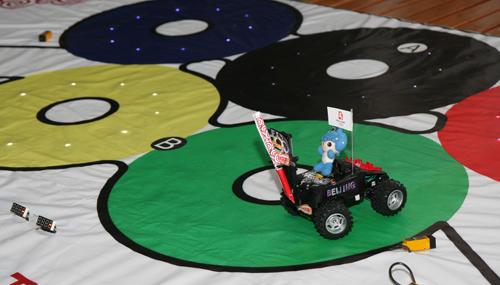 第二届创意机器人挑战赛主题为“梦圆五环 节能相伴”,同学们希望通过比赛以表达他们对北京奥运会的期待和祝福,同时此次参赛的机器人都是由节能环保的材料制成,这也是同济学子积极响应建设节约型校园、节约型社会的一种方式。比赛的赛道以奥运五环为主体,机器人在出发后随即进入表演阶段;表演结束后,机器人举起火炬,并经过五环,点燃五环的小灯,最后通过冲刺走上有六级台阶的平台,并将一路举着的火炬放上火炬台。、