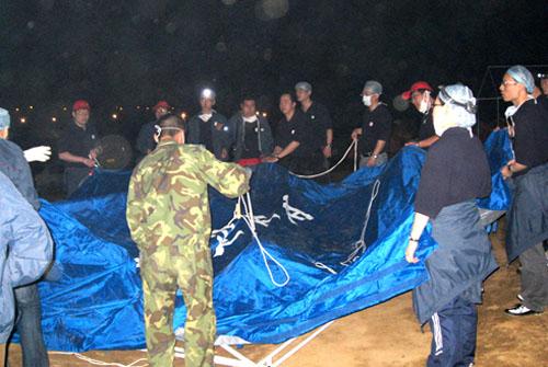 17:00,顺利抵达成都双流机场。几经辗转,经过6个小时的车程终于在23:30到达目的地绵竹。在四川省团委志愿者的指引下,我们决定在绵竹市体育中心的一片刚刚用推土机堆出的土丘上安营扎寨。此时,四周一片漆黑。在电筒和头灯的微弱亮光中,我们先从卡车上卸下100多件随机携带的药品、医疗器械和其他行李。由于经验不足,又花了近1个小时才安装好帐篷,等整理好全部物品时已近凌晨2点。这时,大家都已大汗淋漓。夜色已深,附近也没有找到生活用水,只能用随身携带的湿巾纸擦把脸,就钻进了帐篷。土丘凹凸不平,睡在薄薄的防潮垫上,生平第一次和大地这么近距离的接触。迷迷糊糊中感到帐篷外风雨交加,身下也有震动感,但太累太困,也就沉沉睡去了。