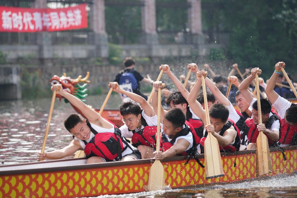 为庆祝中国共产党成立100周年,5月25日,“弘扬伟大的红船精神,新时代青年同舟共济”第十四届“嘉园杯”龙舟赛在嘉定校区举行。来自我校汽车学院等学院代表队、教学班队伍和复旦大学龙舟队等23支队伍的360余名队员参加了比赛。